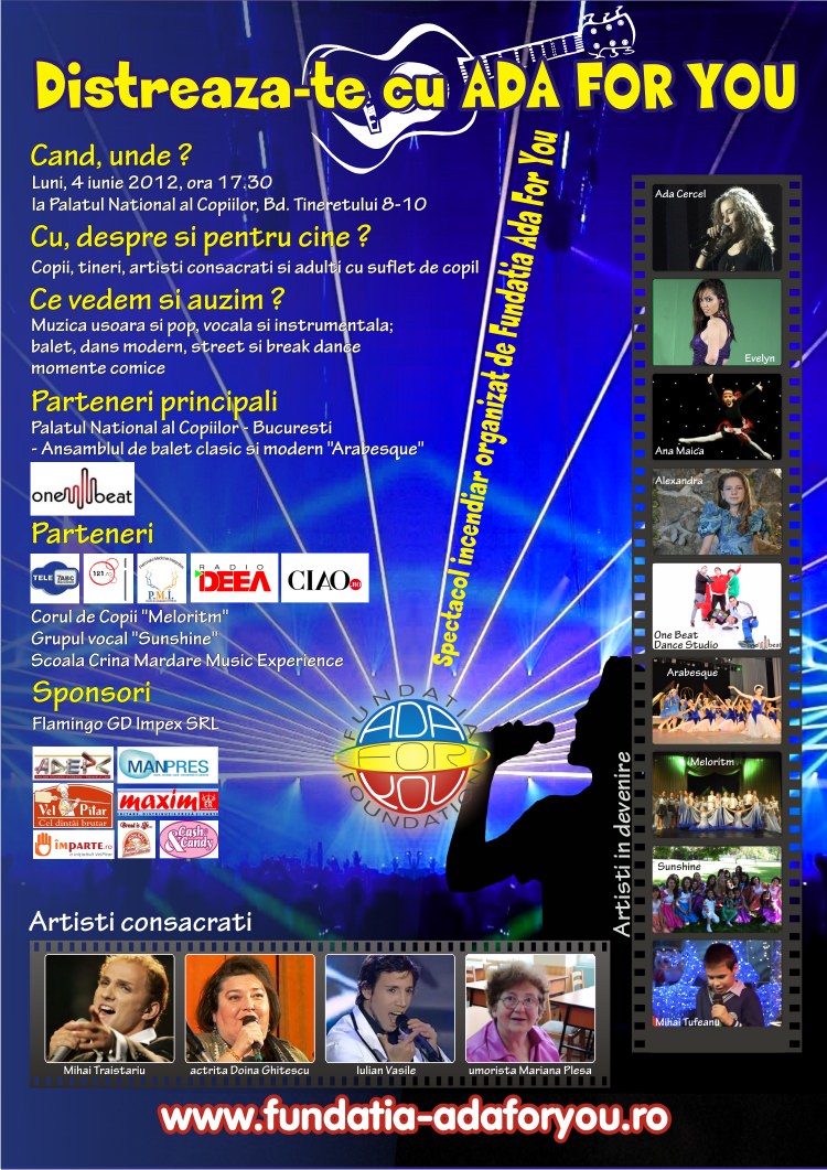 Programul spectacolului este sustinut de copii, tineri talentati si artisti consacrati si va cuprinde muzica usoara si pop, vocala si instrumentala, balet, dans modern, streetdance, breakdance, momente umoristice si o tombola cu premii.